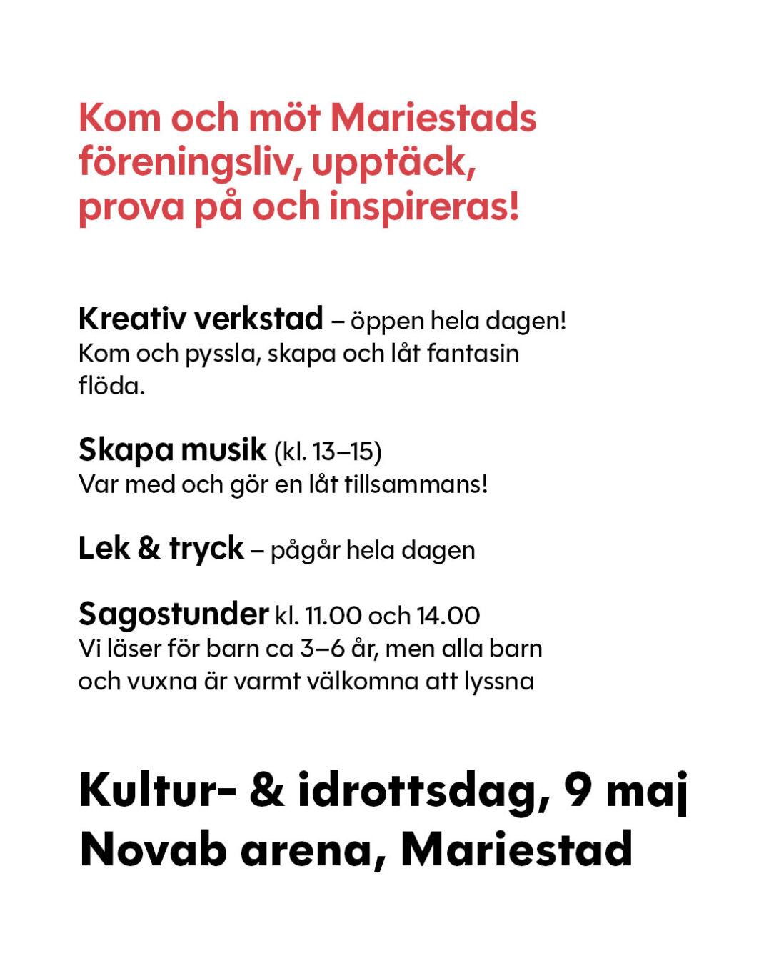 Kom och möt Mariestads föreningsliv, upptäck, prova på och inspireras! Under dagen kan du testa både kultur och idrott, och träffa föreningar som berättar om sina verksamheter. Kanske hittar du något nytt att engagera dig i eller blir medlem i en förening?